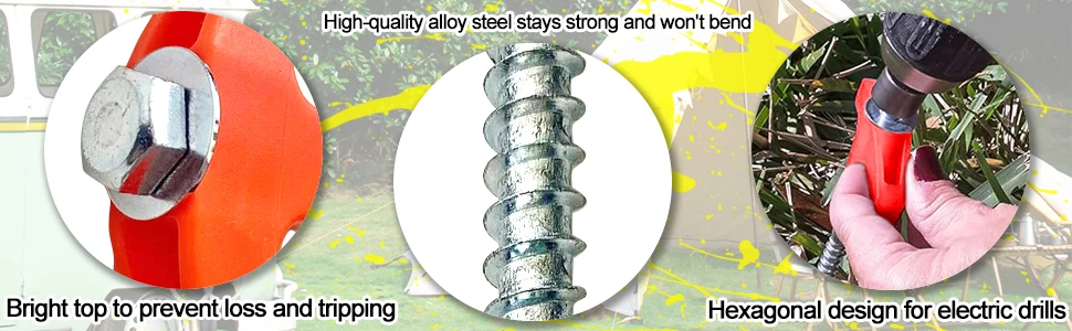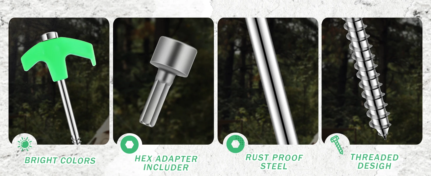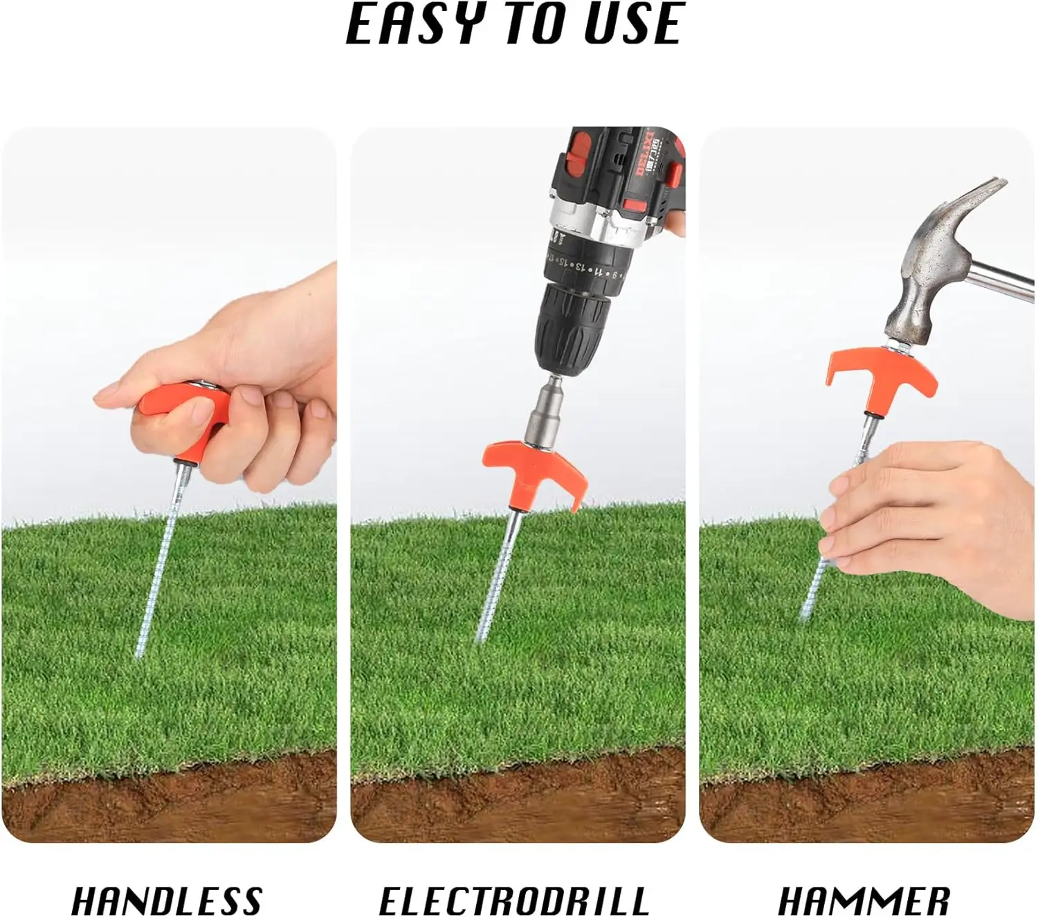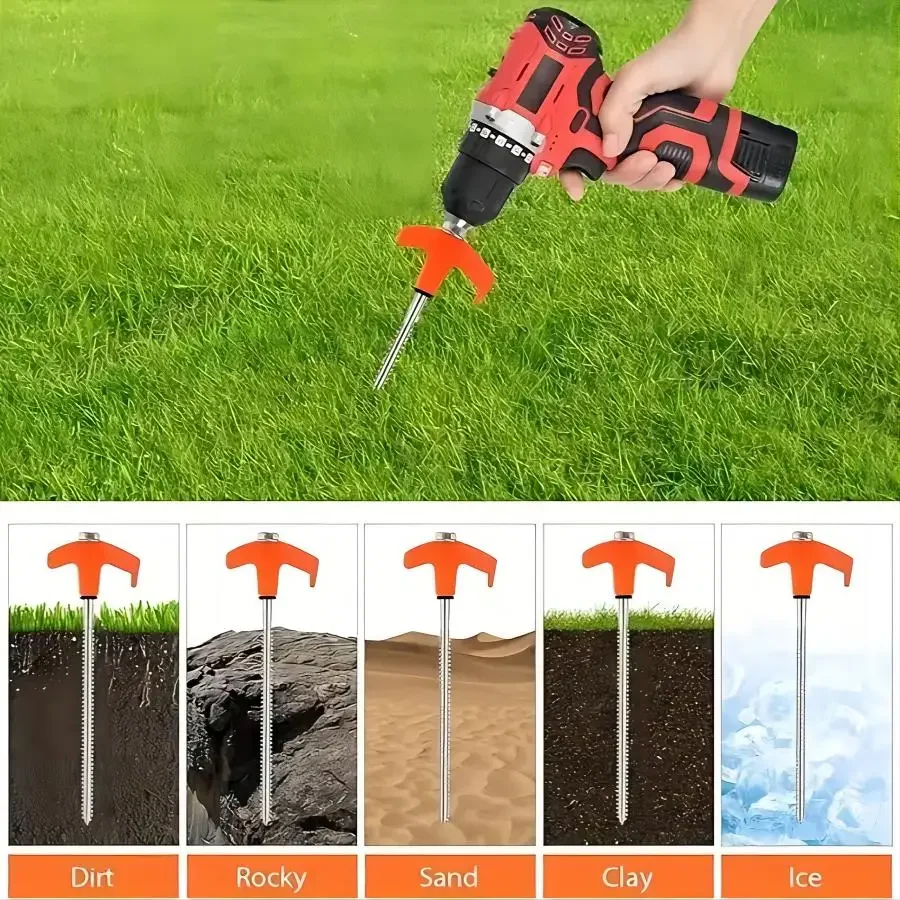 ⛺Hassle-Free Setup - Pointed tips and spiral design make insertion into hard soil effortless. Utilize a cordless drill or impact driver for quick setup, saving time and effort during campsite assembly.